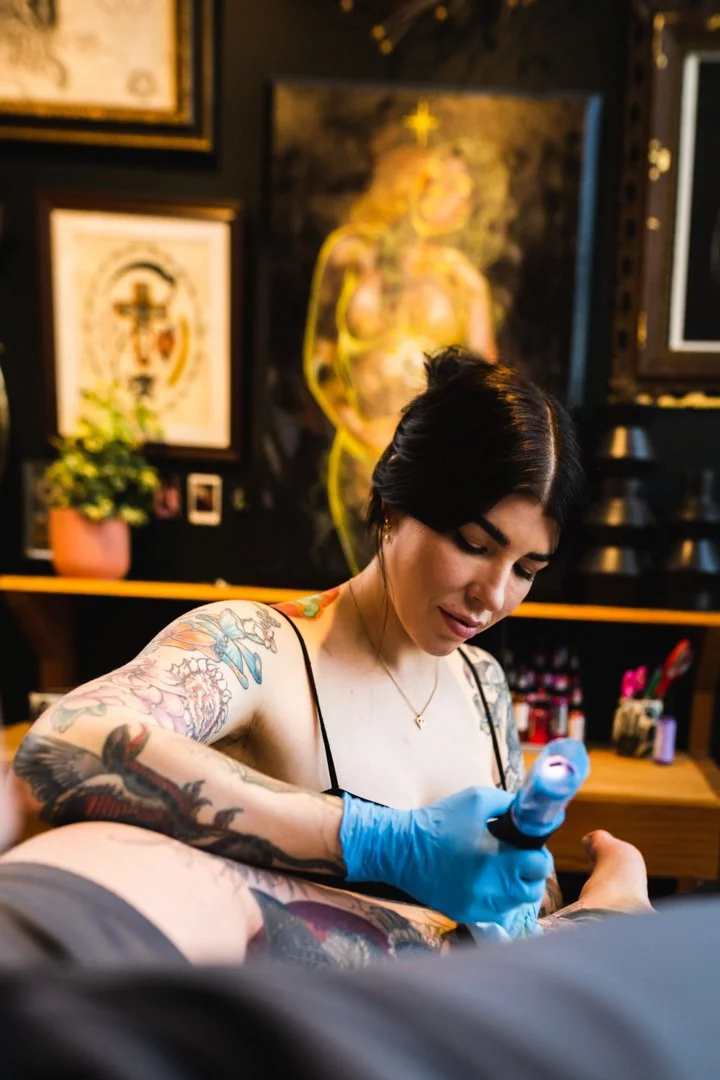 With over 18 years of tattooing experience Samantha Smith aka Scragpie has built a reputation on her strong personal style, clean execution, and striking compositions that move naturally with the body. Her pieces often blend elements of nature, mythology, and surrealism, resulting in tattoos that feel both powerful and intimate. At the heart of her practice is the belief that tattooing is much deeper than visual art, it is based in connection, transformation, and storytelling that is deeply human and timeless.